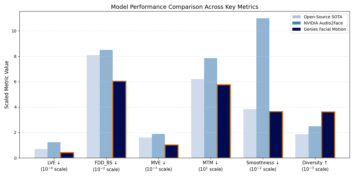 Fig. 2: This bar chart illustrates the performance of three models—Open-Source SOTA, NVIDIA Audio2Face, and our In-House Genies Facial Motion model—across six distinct metrics. The best performance model is highlighted by orange outline, notice our In-House model achieved best result across all metrics.